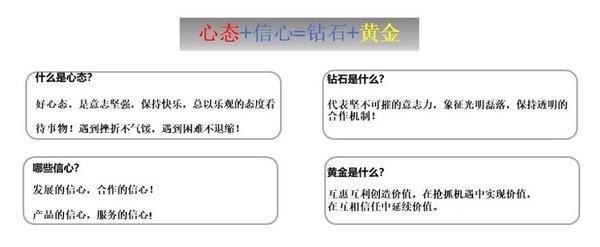 于孟生董事長在演講中表示:“心態(tài)+信心=鉆石+黃金”